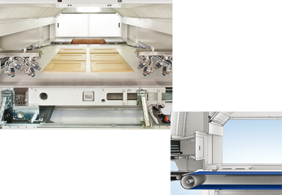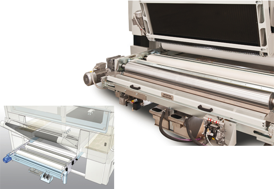 EASY工件传输系统,采用的皮带为不易磨损和不易腐蚀的碳纤维带(CFB),长1950mm,因此实现了其可回收漆料、使用寿命较长、便于更换、可不易涂料沾到工件底面、封边带涂漆质量较好的特点。配有可定位的清洁小车和皮带自动定中装置。传输皮带首尾端位于喷涂厢外,实现了皮带首尾处气流量较好并不易被空喷漆雾污染。