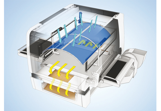 从增压室抽吸的空气,可将空喷漆雾带入干式过滤系统,后再送入排风机。抽风系统,配备装有双干式过滤器的大面积过滤区。进出和拆卸简单,方便维护。