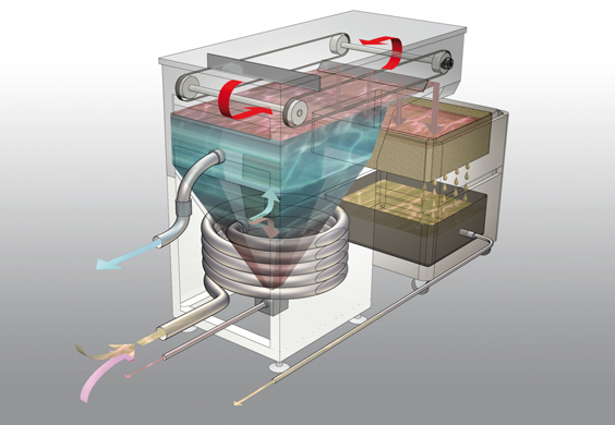 污水被送入水箱,此处水中的漆分子凝成絮状并被滤除。滤渣被刮板推送到过滤袋中,而过滤后的清水则进行再利用。