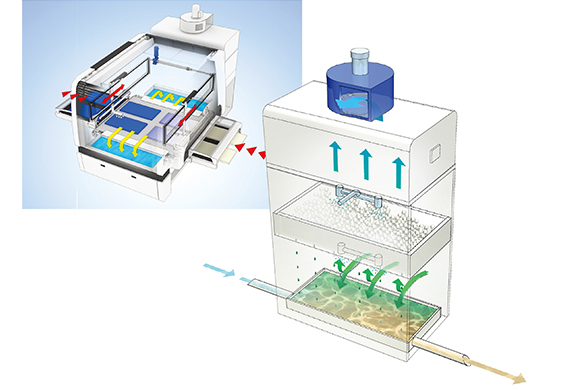 从增压室抽吸的空气,可将空喷漆雾带入水帘式过滤系统,接着送入“Scrubber”喷洗装置- 截留固体残留物 – 再送入排风机 。喷洗器
