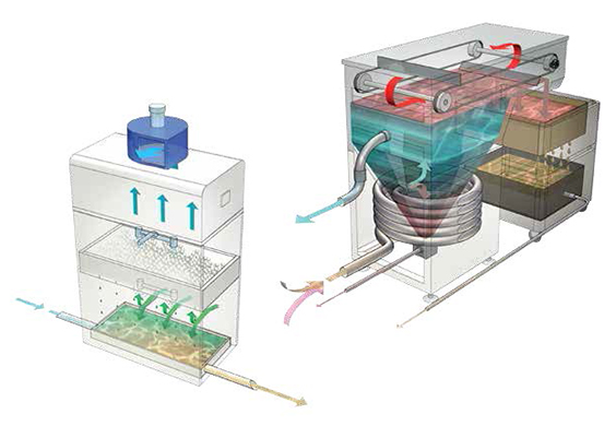 从增压室抽吸的空气,可将空喷漆雾带入水帘式过滤系统,接着送入“Scrubber”喷洗装置 - 截留固体残留物 - 再送入排风机 。