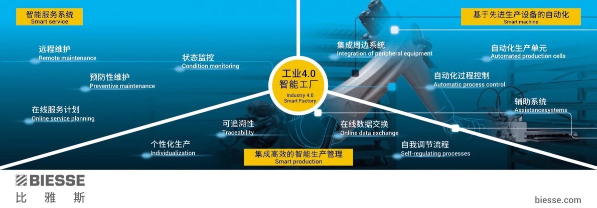 科技以赋能,智造创未来,Biesse(比雅斯)致力于将行业愿景变为现实,推出达到工业4.0需求的管理软件和服务平台,结合自动化系统,软件与硬件相结合,助力企业重构生产方式,实现工业4.0。