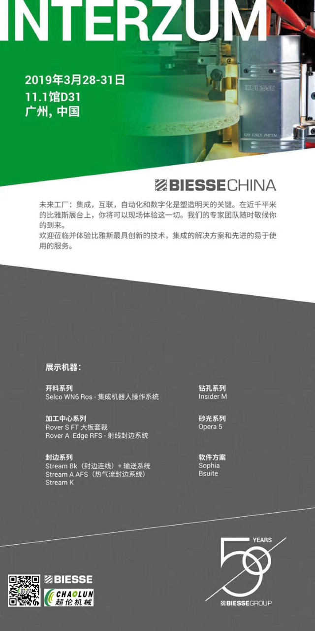 2019年3月28-31日的广州国际家具生产设备及配料展(CIFM/Interzum Guangzhou)上,近千平米的展台,自动化和数字化工艺亮点展示,比雅斯将为不同类型的板式家具生产企业带来与众不同的体验。